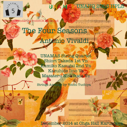 因爵士乐录音闻名的UNAMAS唱片公司首次挑战古典音乐。 2014年,大雪的轻井泽·大贺音乐厅。以小提琴演奏家竹田诗织为首,4名青年演奏家组成四重奏乐团,演奏了维瓦尔第(Vivaldi)最为著名的弦乐四重奏作品《四季》。乐团成员们分别录制了每个季节为代表的乐章中的独奏部分,各自带来了对经典的全新诠释。其中春季为第二小提琴独奏,夏季为大提琴独奏,秋季为中提琴独奏,冬季为第一小提琴独奏。如此充满活力的“四季”,可谓至今未见。 利用最新科技,完全执着于高解析度录音,给听众带来无与伦比的速度感和重量感,让人意想不到这竟是弦乐四重奏。192kHz/24bit 清晰地捕捉到了4种乐器制造的细微装饰音。双声道欣赏起来已经极为出色,可能的话,推荐五声道。现场录音采用的麦克风朝上设置,收录了从舞台天花板倾泻流淌的反射音。这是迄今为止保守的古典音乐录音中从未应用过的手法。通过这种颠覆常识的做法,将不断开拓和扩展全新的Hi-Res音乐世界。 轻井泽·大贺音乐厅 大贺音乐厅是由前索尼集团董事长,被誉为“CD之父”的大贺典雄先生斥资16亿日元建造的一个仅有700个座位的小音乐厅。由于它的五边形结构,舞台距每一个座位都相对更靠近。巧妙的空间布局有效规避了可能发生的环境音干扰,使声音的反射总能做到恰如其分,清脆而不出现浑浊,这种独特的平衡正是音乐厅给演奏家和听众们听觉上的卓越体验。 录音数据: Rec/Mix/Mastering: Mick Sawaguchi Assistant Engineer/Digital Editing: Kazuya Nagae MADIRec RME:Micstacy DMC842 OctmicXTC/MADI face XT: Syntax Japan DAW Pyramix8.1 HORUS: DSP JAPAN Squoia12: Kazuya Nagae PS & cables: AcousticRevive 4KPV Production: Marimo Records Producer: Mick Sawaguchi